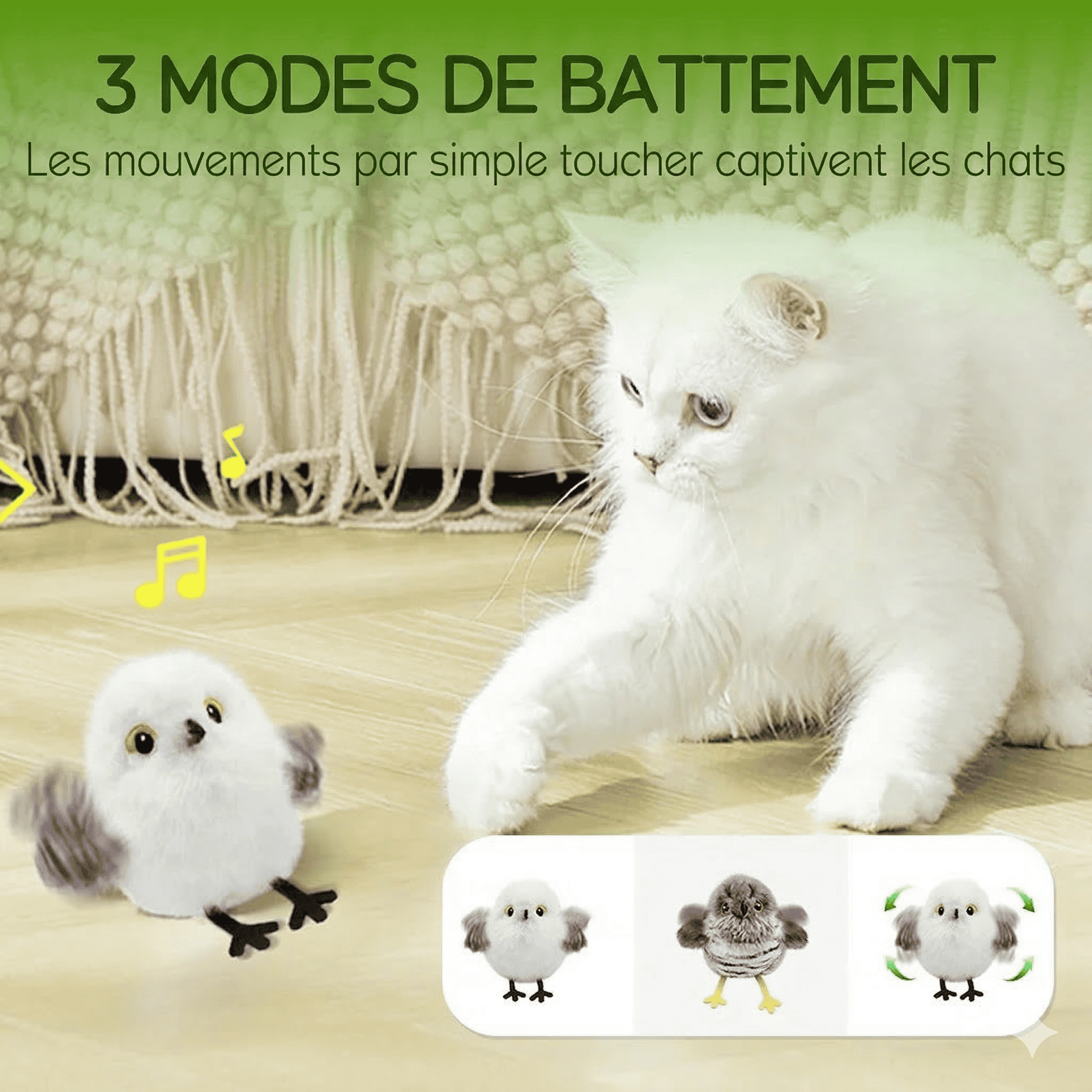 Une légère tape suffit à activer des mouvements de battements imprévisibles qui captivent les chats. Plusieurs modes s'adaptent à différents besoins, favorisant l'activité physique et la stimulation mentale. Le mode veille automatique permet d'économiser la batterie lorsque l'appareil n'est pas utilisé.