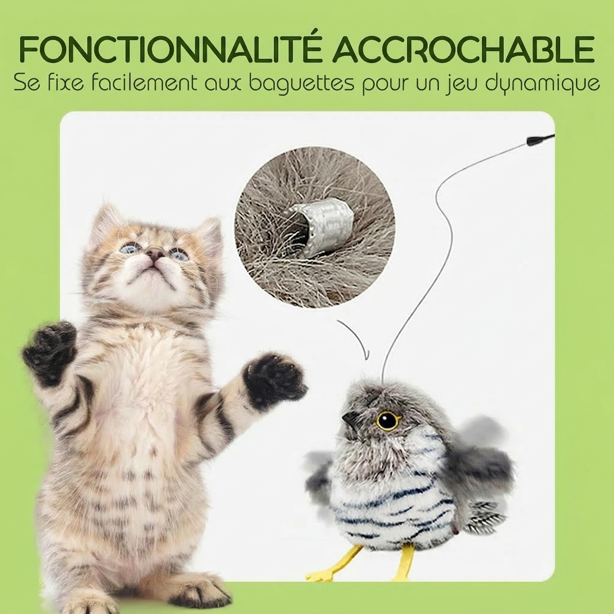 Facile à fixer à une canne à pêche pour chat. Il balance et oscille comme une proie réelle, ce qui stimule l'instinct de votre chat et transforme le jeu quotidien en aventures de chasse passionnantes.